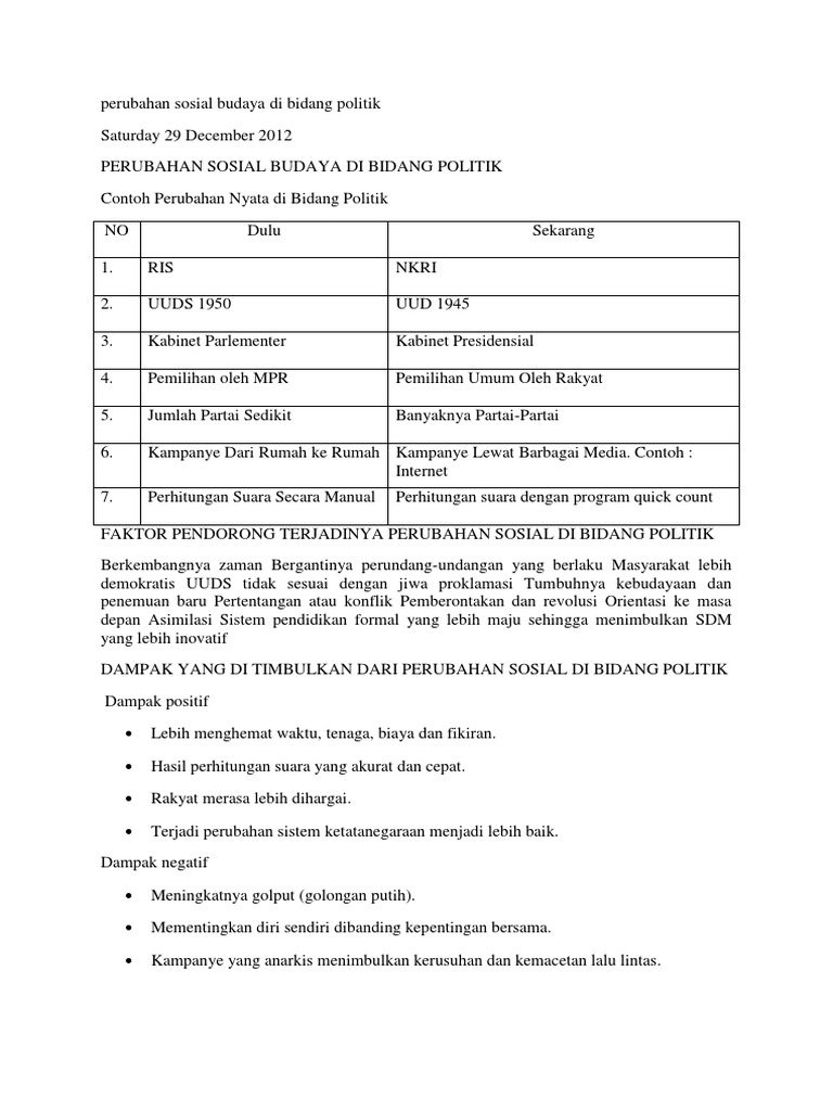 Contoh Perubahan Sosial Budaya Di Bidang Politik - Temukan Contoh