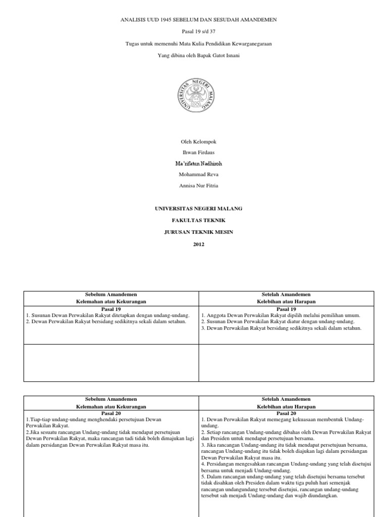 DOC) ANALISIS UUD 1945 SEBELUM & SESUDAH AMANDEMEN PASAL 1 s/d 18B | rahmi fadhila - Academia.edu