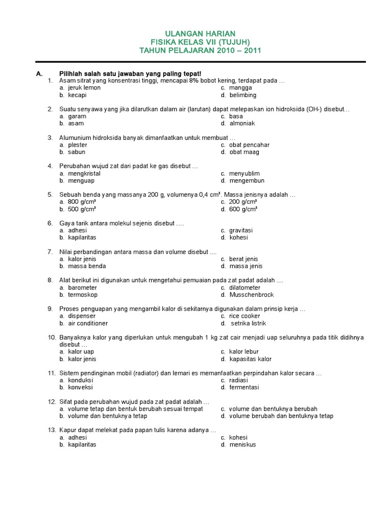 Ulangan Harian Fisika Kelas Vii (Tujuh) TAHUN PELAJARAN 2010 – 2011