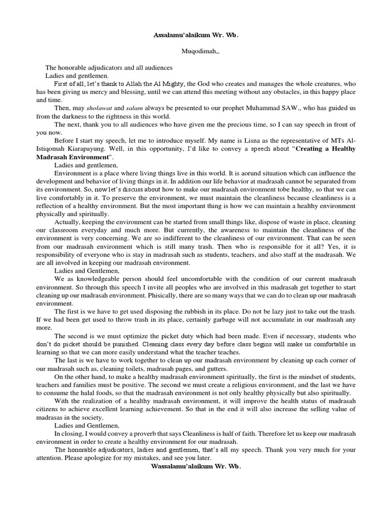 Contoh Pidato Bahasa Inggris Tentang Menciptakan Lingkungan Madrasah Yang Sehat - Temukan Contoh