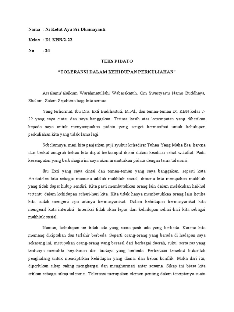 Nama: Ni Ketut Ayu Sri Dhamayanti Kelas: D1 KBN/2-22 No: 24 Teks Pidato “ Toleransi Dalam Kehidupan Perkuliahan”