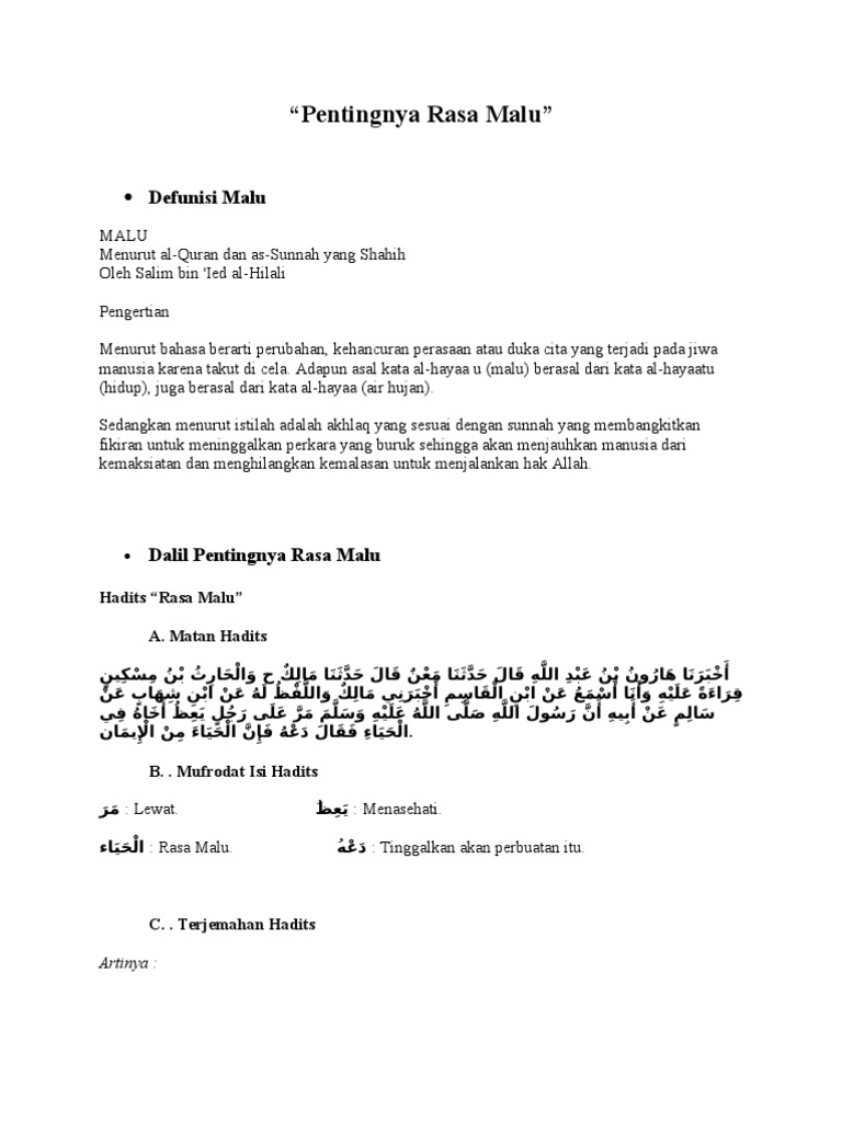 Makalah Hadits Pentingnya Rasa Malu (HidayatXII Invincible)