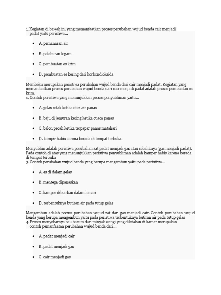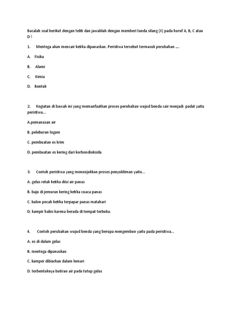 01. Benda padat berubah wujud men- - ? ยท 01. Benda padat berubah wujud men- jadi cair jika …. (A) Didinginkan (B) Dipanaskan (C) Dicairkan (D) Diuapkan 02. Air dapat menjadi benda - [PDF Document]