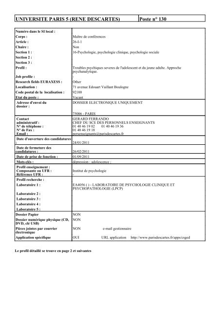 UNIVERSITE PARIS 5 (RENE DESCARTES) Poste n° 130