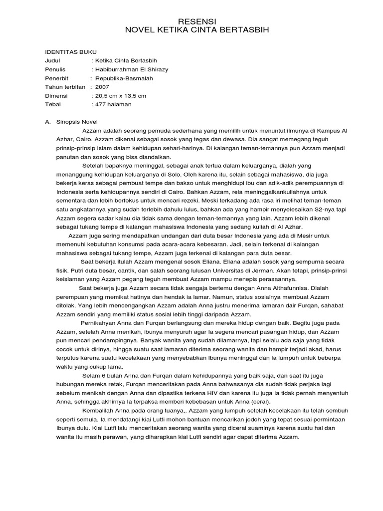 resenesi b.indo kcb.txt - Resensi Novel ketika cinta bertasbih Text Box Ketika Cinta Bertasbih I IDENTITAS BUKU a Judul Ketika Cinta Bertasbih b Penulis | Course Hero