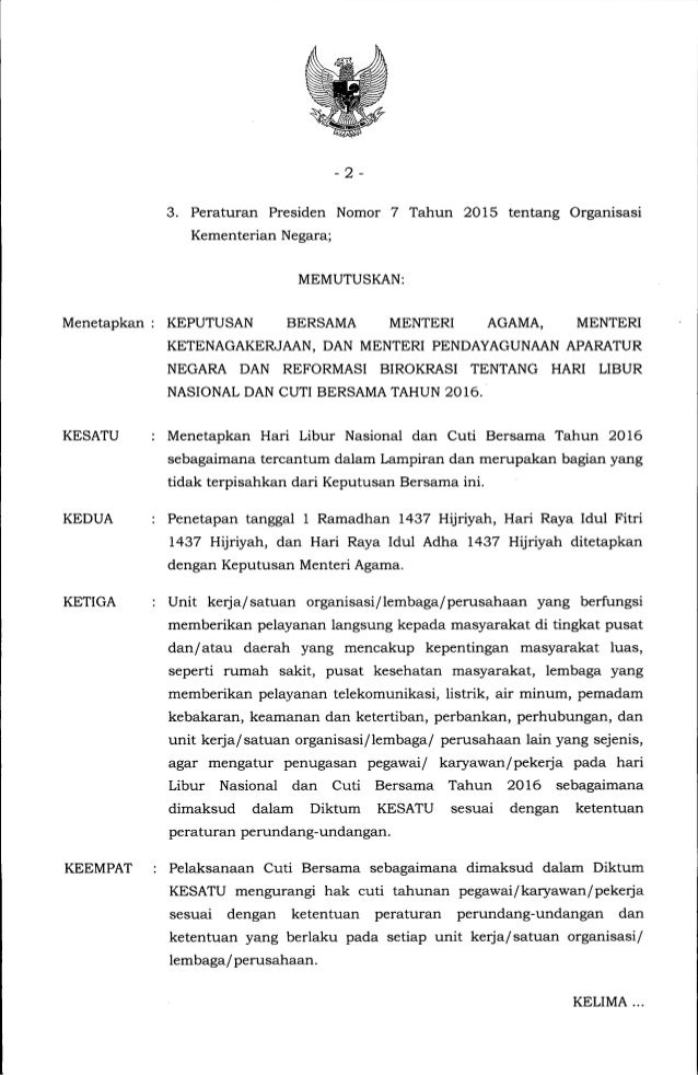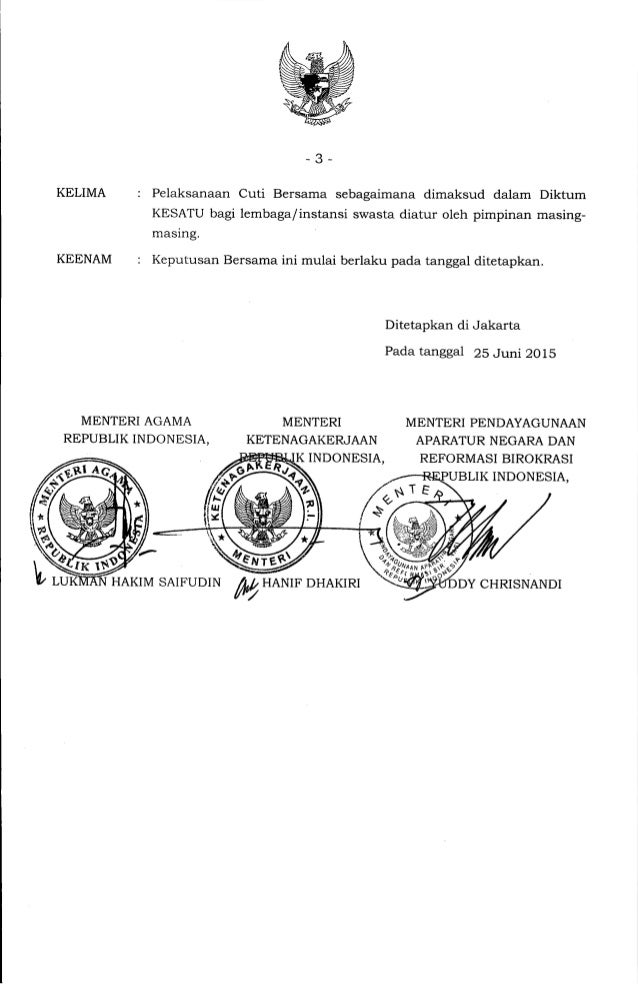 Skb 3 Menteri tentang Hari Libur Nasional dan Cuti Bersama Tahun 2016