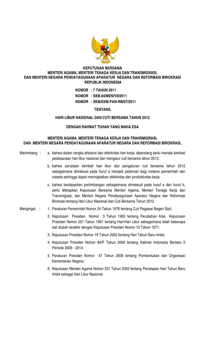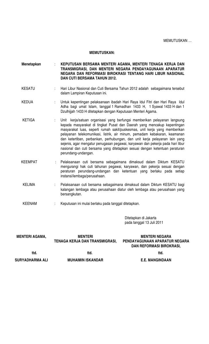 5 TAHUN 2012 SKB.06/MEN/VII/ TAHUN 2012 TENTANG HARI LIBUR …