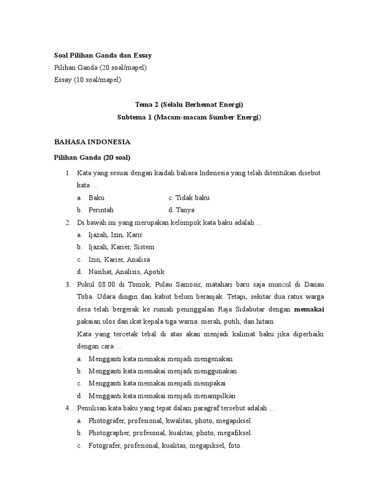 Soal Tematik Kelas 4 SD Tema 2 Subtema 3 Energi Alternatif dan …