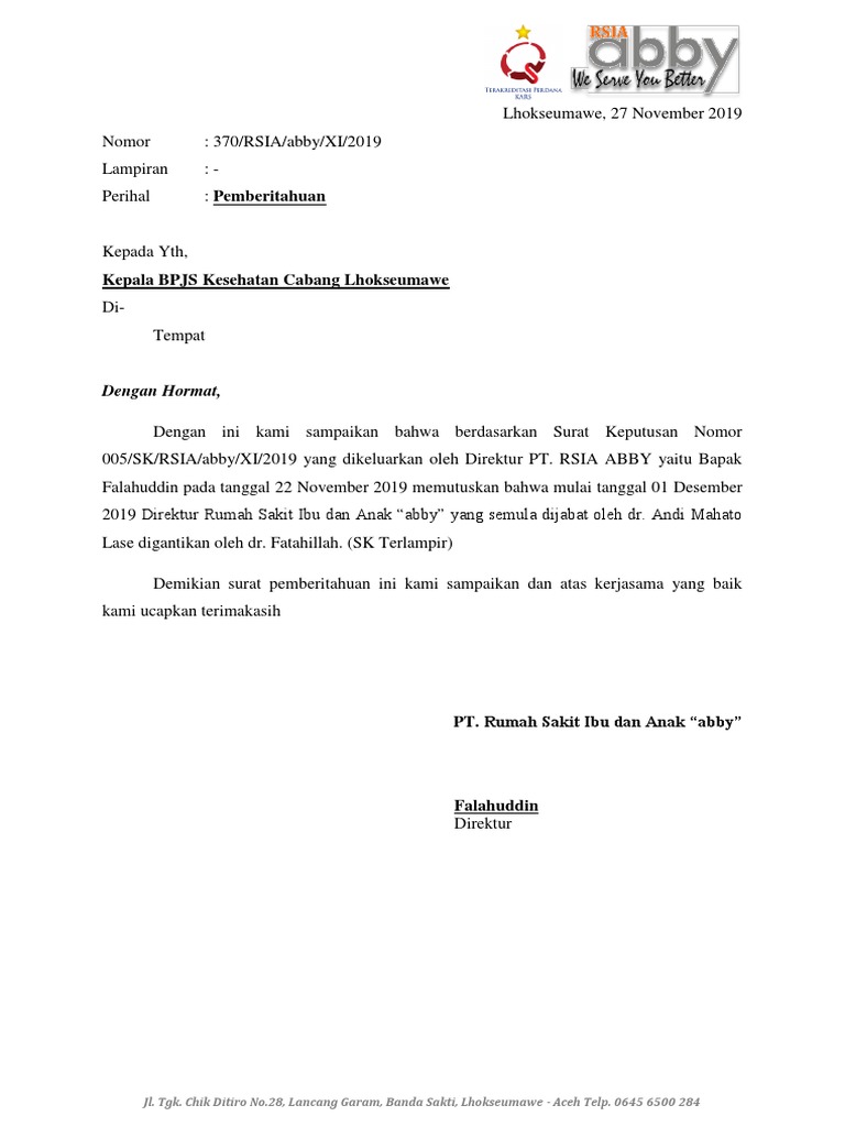 SURAT Pemberitahuan Pergantian Direktur Ke BPJS KES