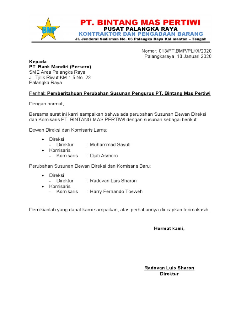 Contoh Surat Pemberitahuan Perubahan Susunan Pengurus PT. Bintang Mas Pertiwi