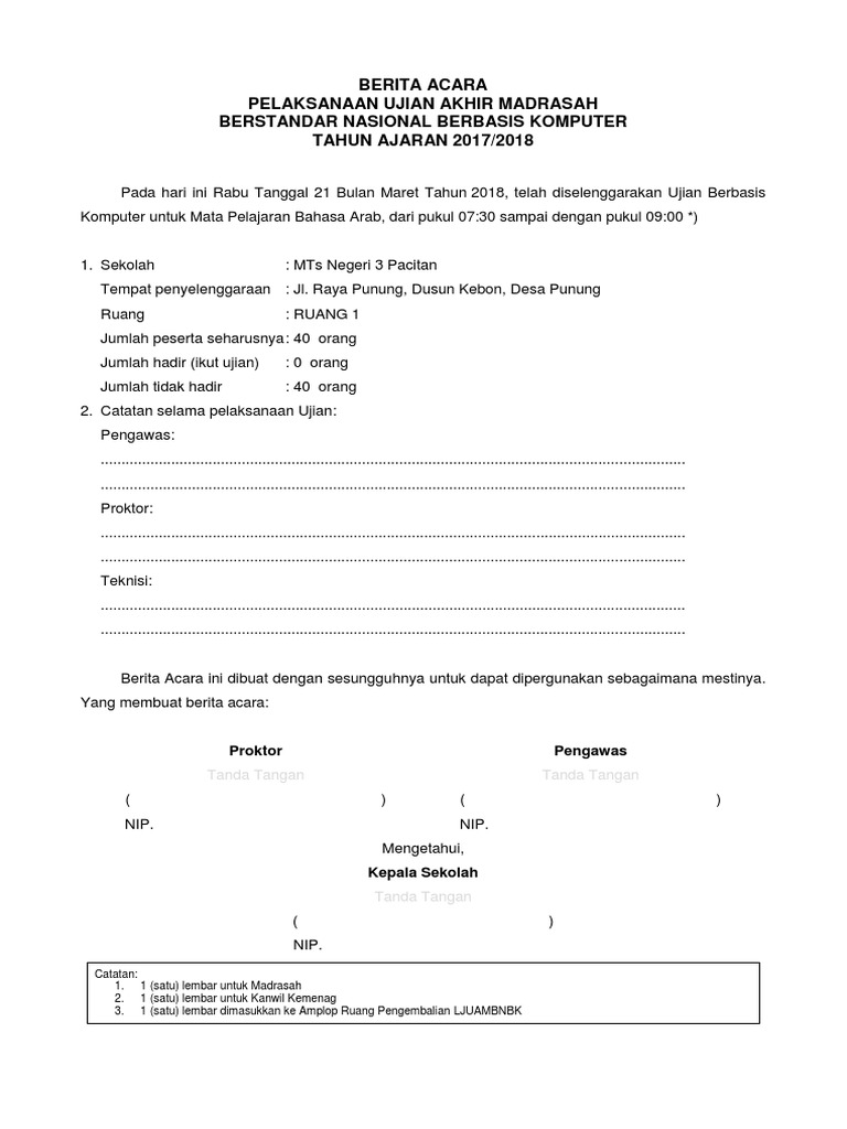 contoh Berita Acara UAMBNBK Bahasa Arab Sesi 1 MTS