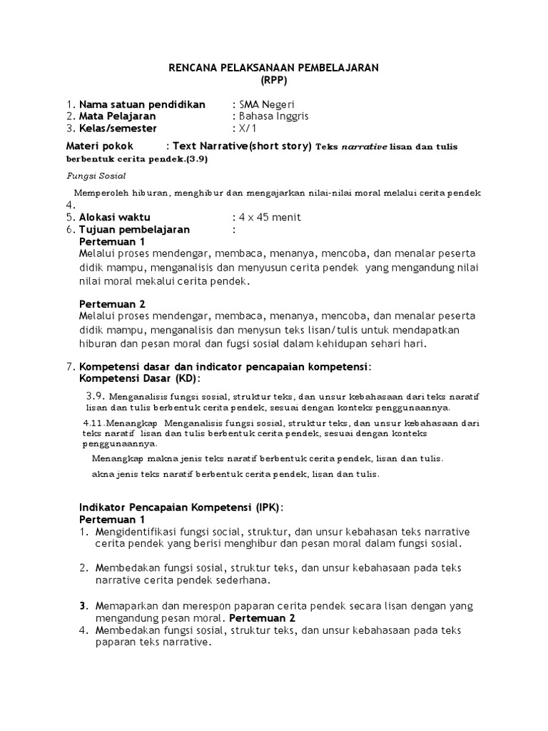 Rpp Bahasa Inggris SMK kelas X teks Narative