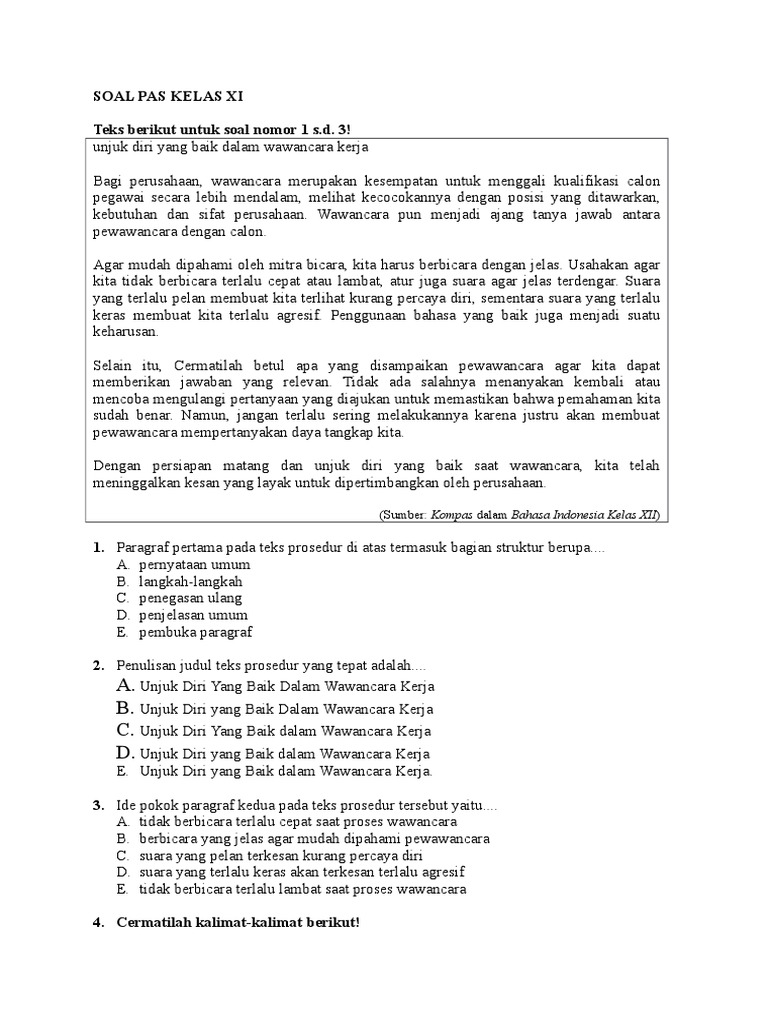 soal bindo kls x1 sma.docx - Berikut soal UTS B.Indonesia kelas 11 semester satu K13 dengan kunci jawabannya untuk siswa SMA/SMK/MA/MAK/Sederajat 1 | Course Hero