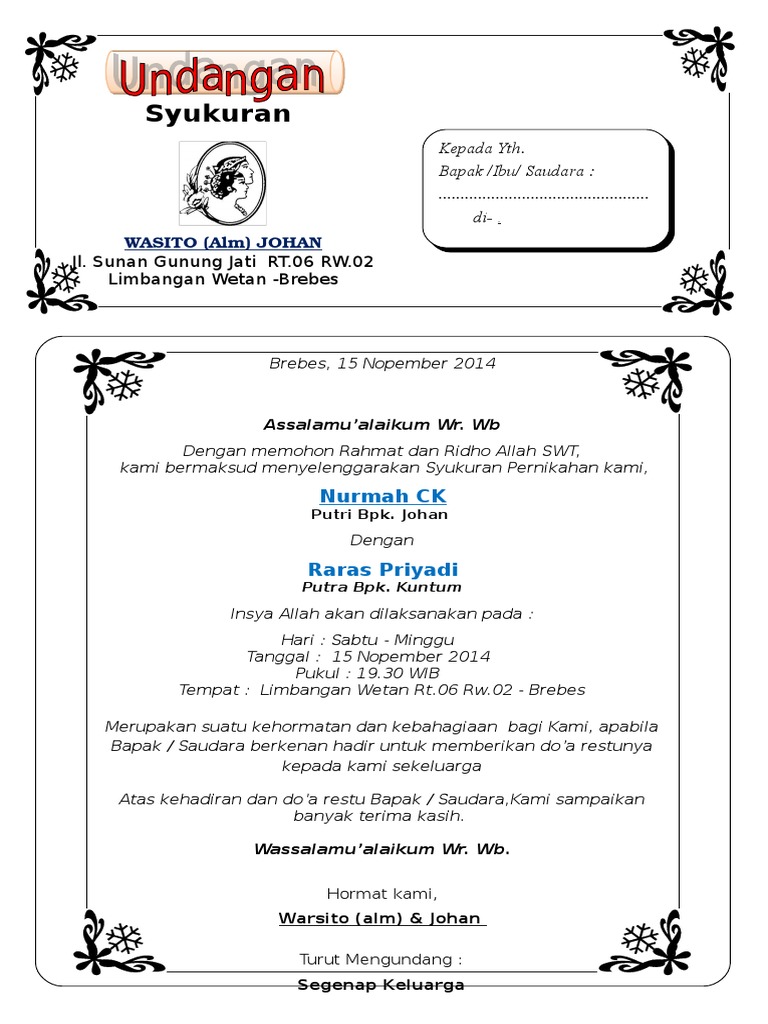 DOC) Contoh Surat Undangan Syukuran Pernikahan | Liwaassin Lampbara - Academia.edu