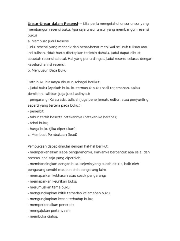 Unsur/sistematika resensi: 1.judul resensi 2.identitas resensi 3.pendahuluan 4.isi - Brainly.co.id