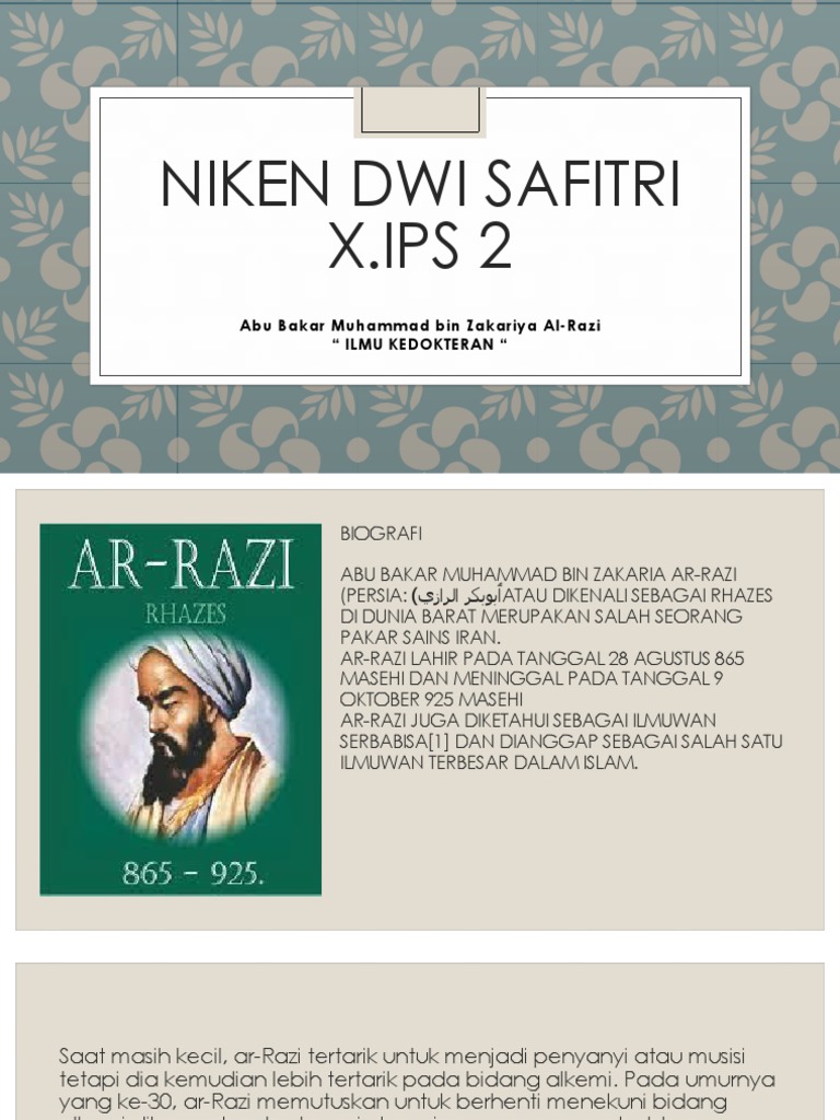 Niken Dwi Safitri X.Ips 2: Abu Bakar Muhammad bin Zakariya Al-Razi Ilmu Kedokteran