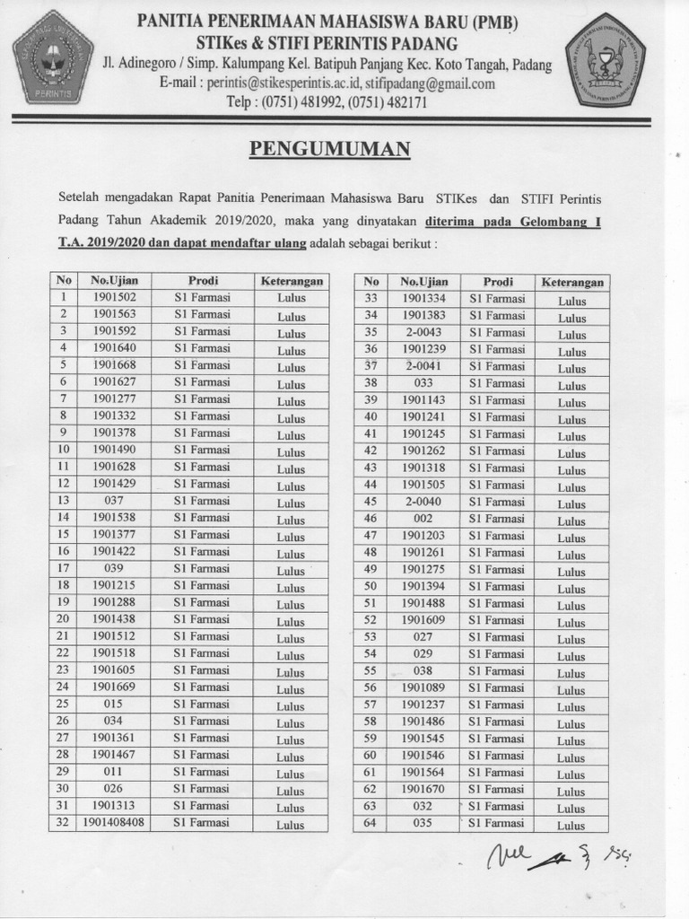 Pengumuman Kelulusan Penerimaan Mahasiswa Baru 20202 Gelombang II Tahap I | STIKes PERINTIS