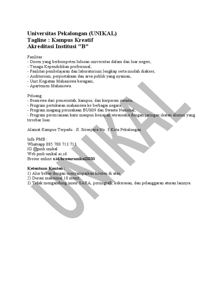 Universitas Pekalongan (UNIKAL) Tagline: Kampus Kreatif Akreditasi Institusi “B”