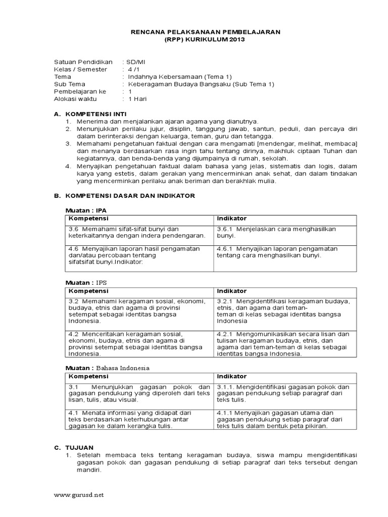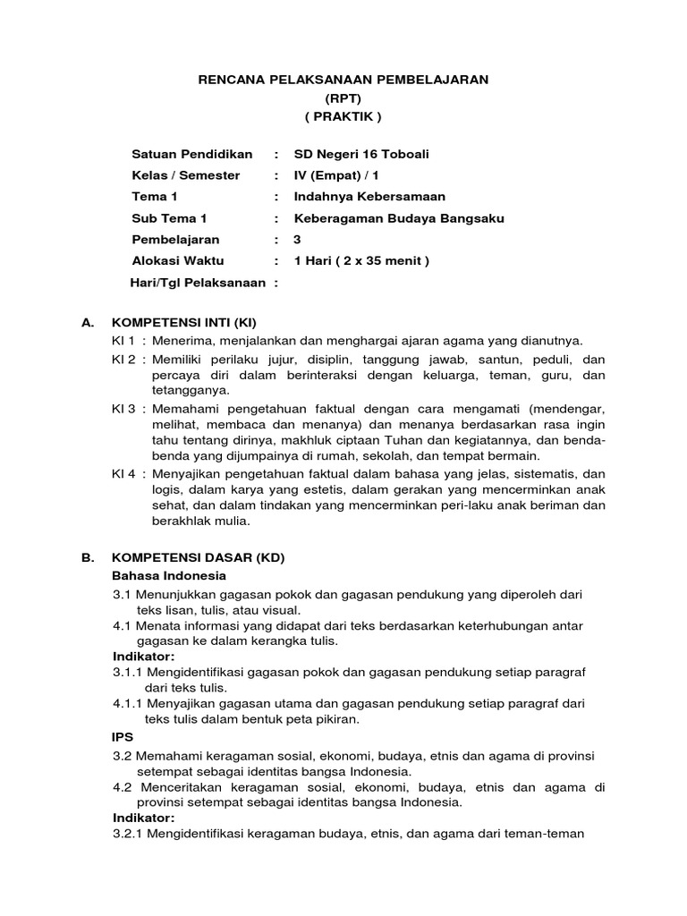 RPP Kelas 4 Tema 1 Subtema 1 Pembelajaran 4, Keberagaman Budaya Bangsaku - Membangun Inspirasi
