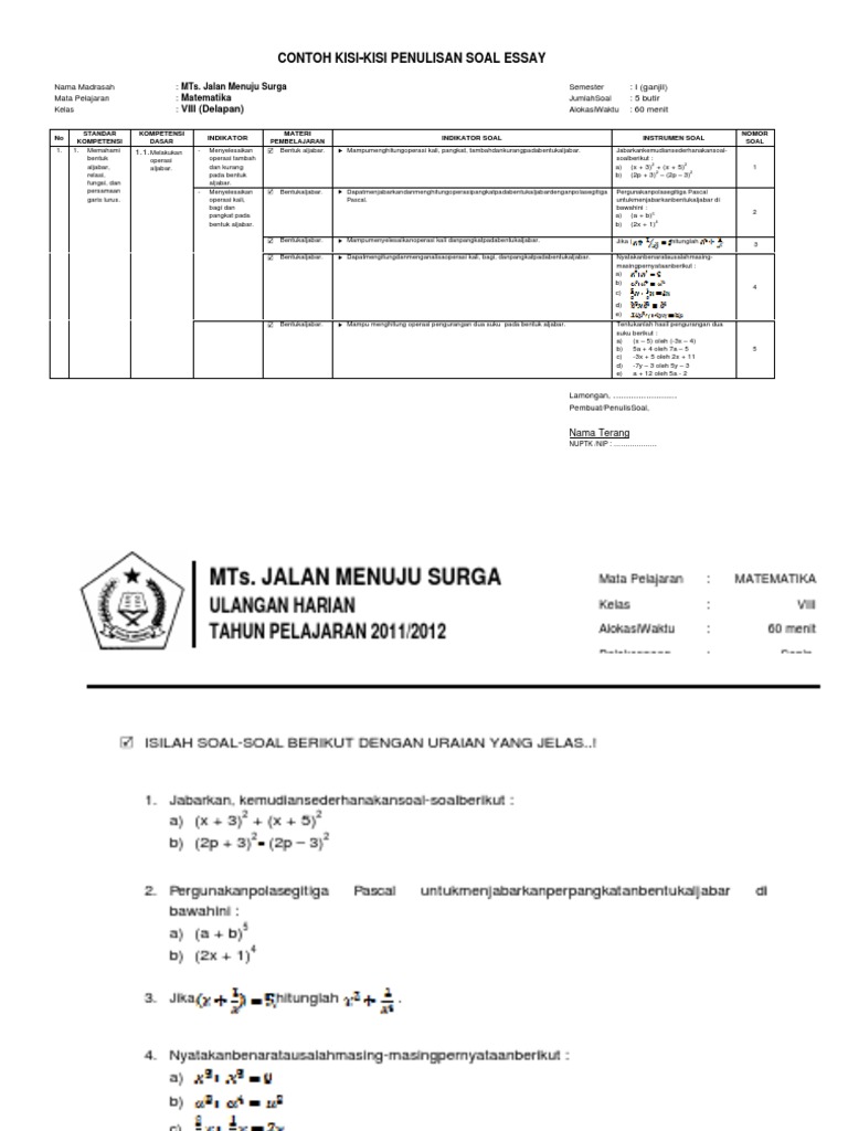 Kumpulan Contoh Soal: Contoh Kisi Kisi Soal Uraian
