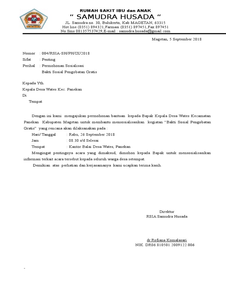 Contoh Format Surat Permohonan Bantuan Tenaga Medis Untuk Acara Pengobatan Gratis