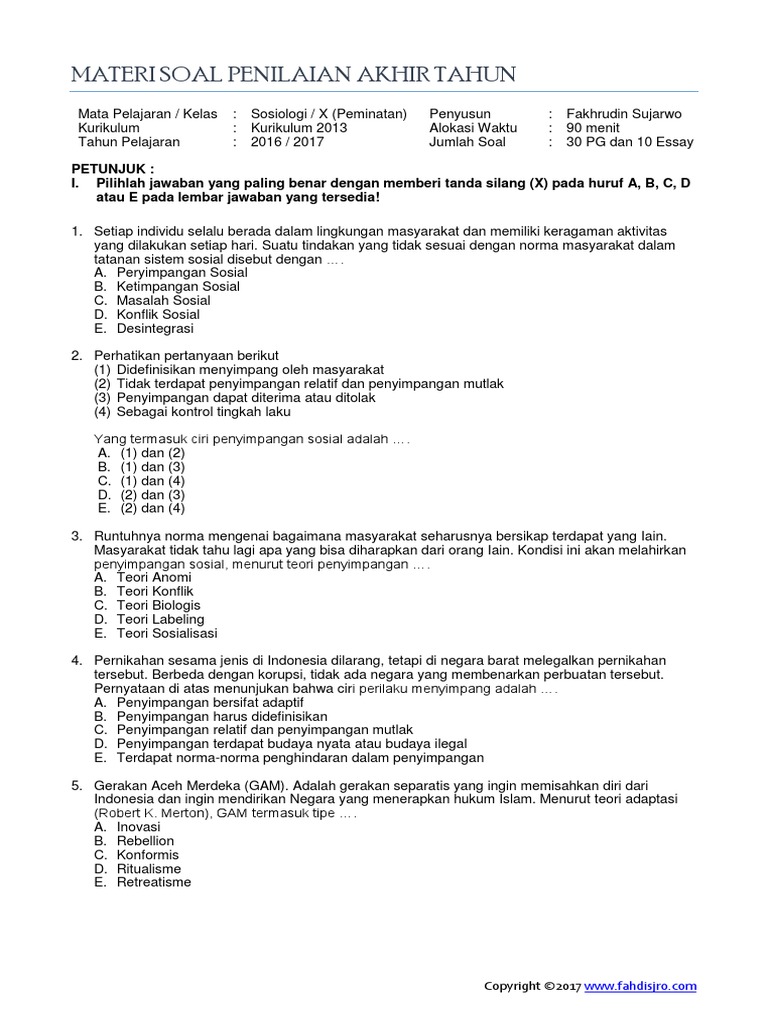 Contoh Soal Uas Sosiologi Kelas X Semester 2 (Pg Dan Essay …