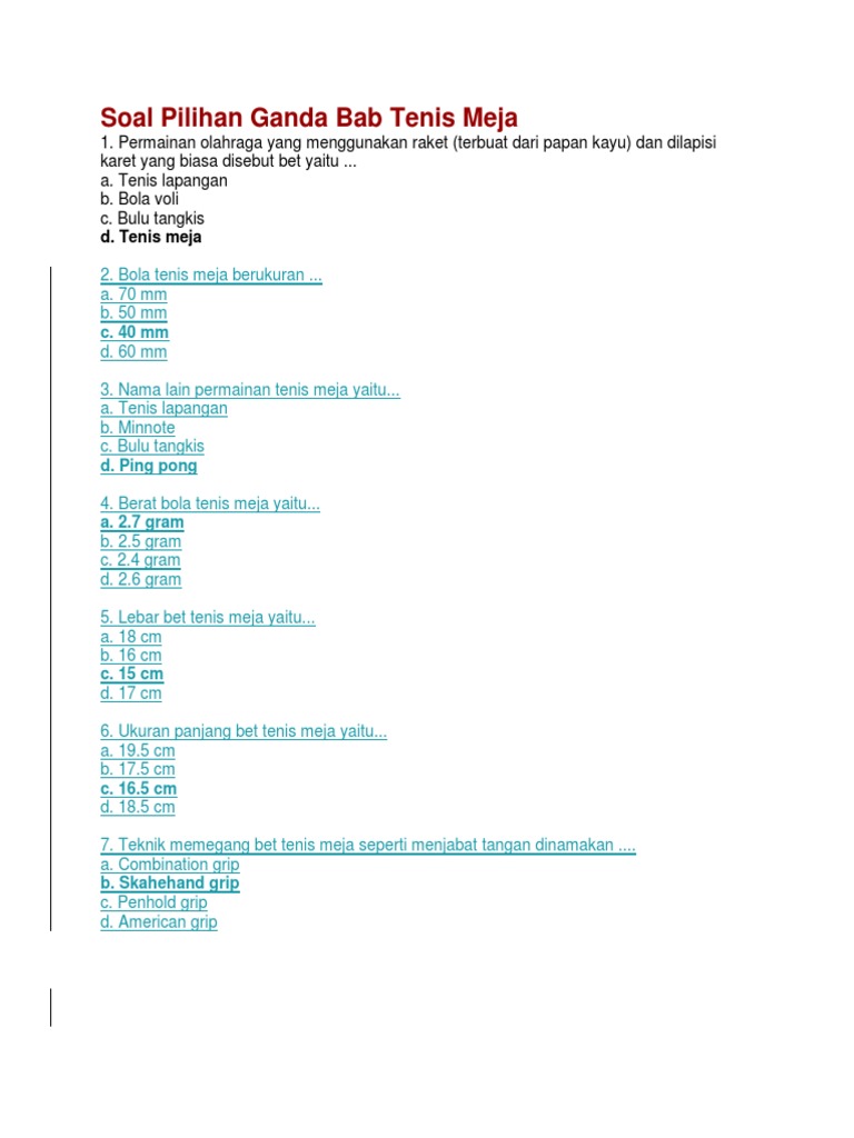 Soal Tenis Meja Pilihan Ganda Beserta Jawabannya - Manglada Tech