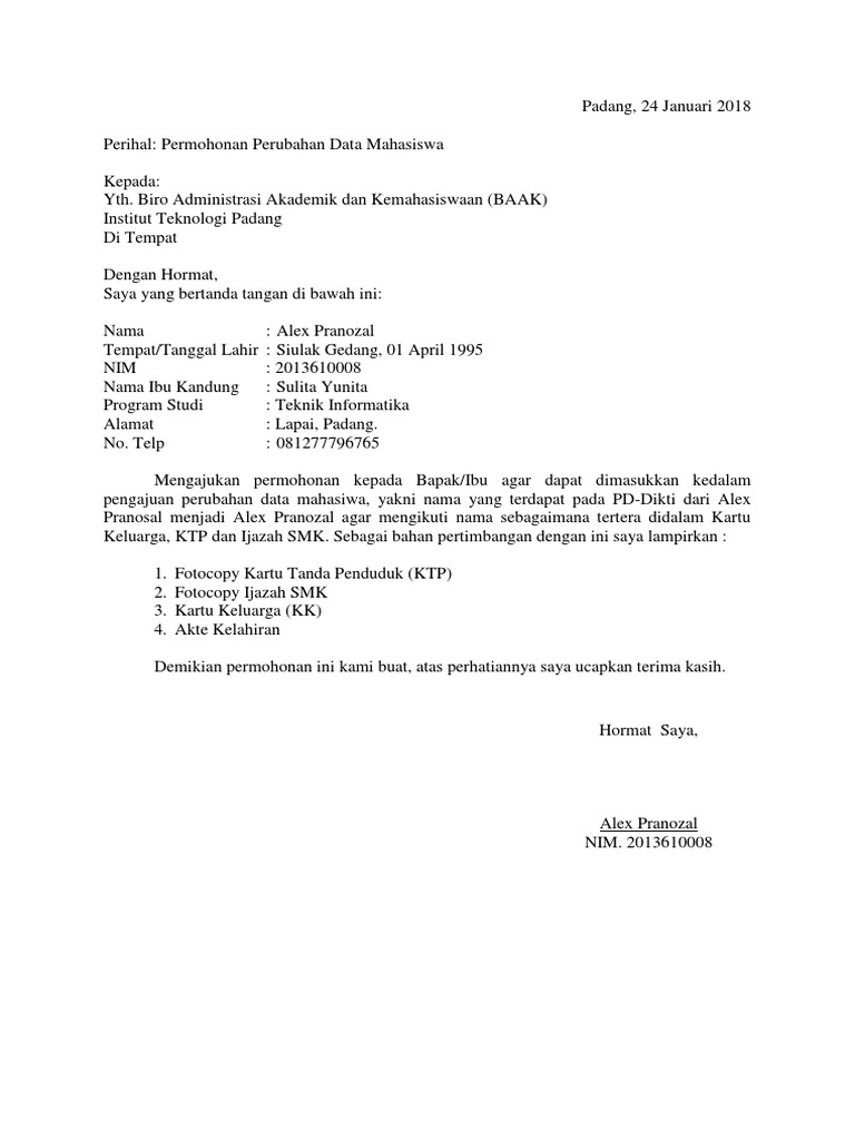 Contoh Surat Permohonan Perubahan Data Mahasiswa - Kumpulan Contoh Surat