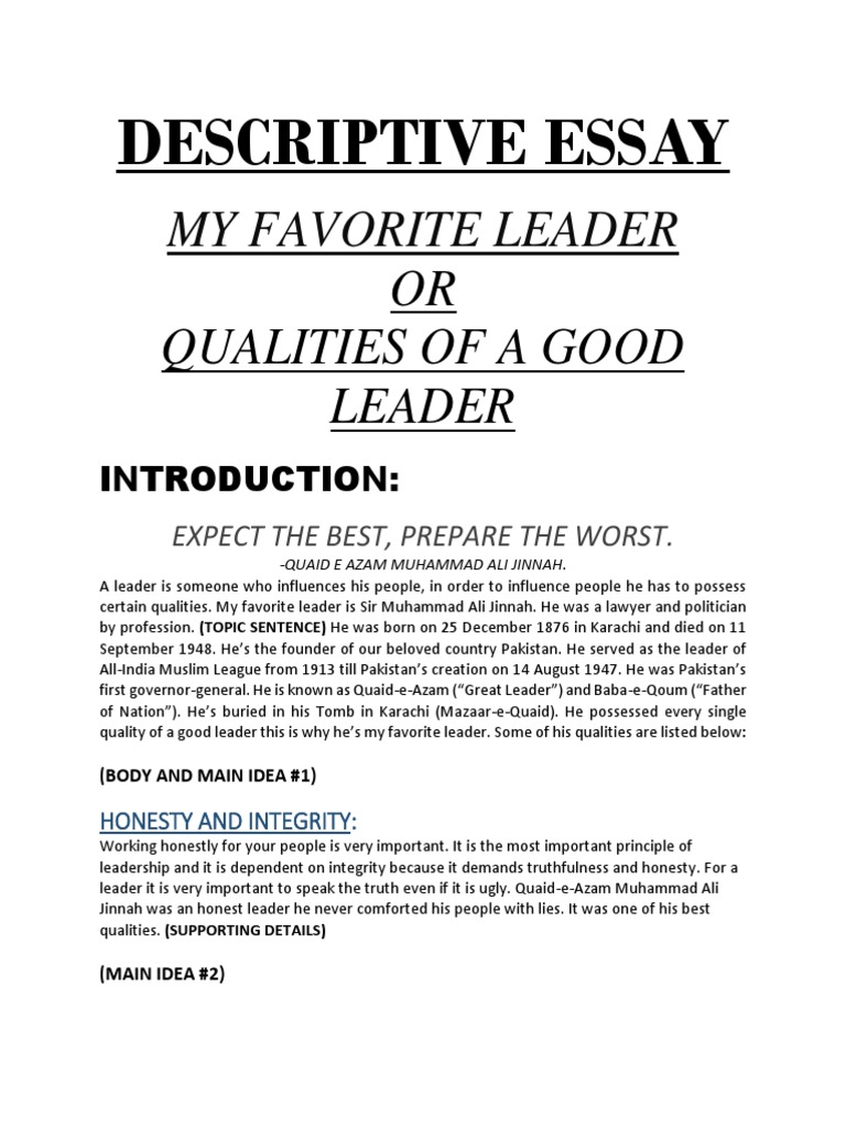 Descriptive Essay | Muhammad Ali Jinnah | Leadership