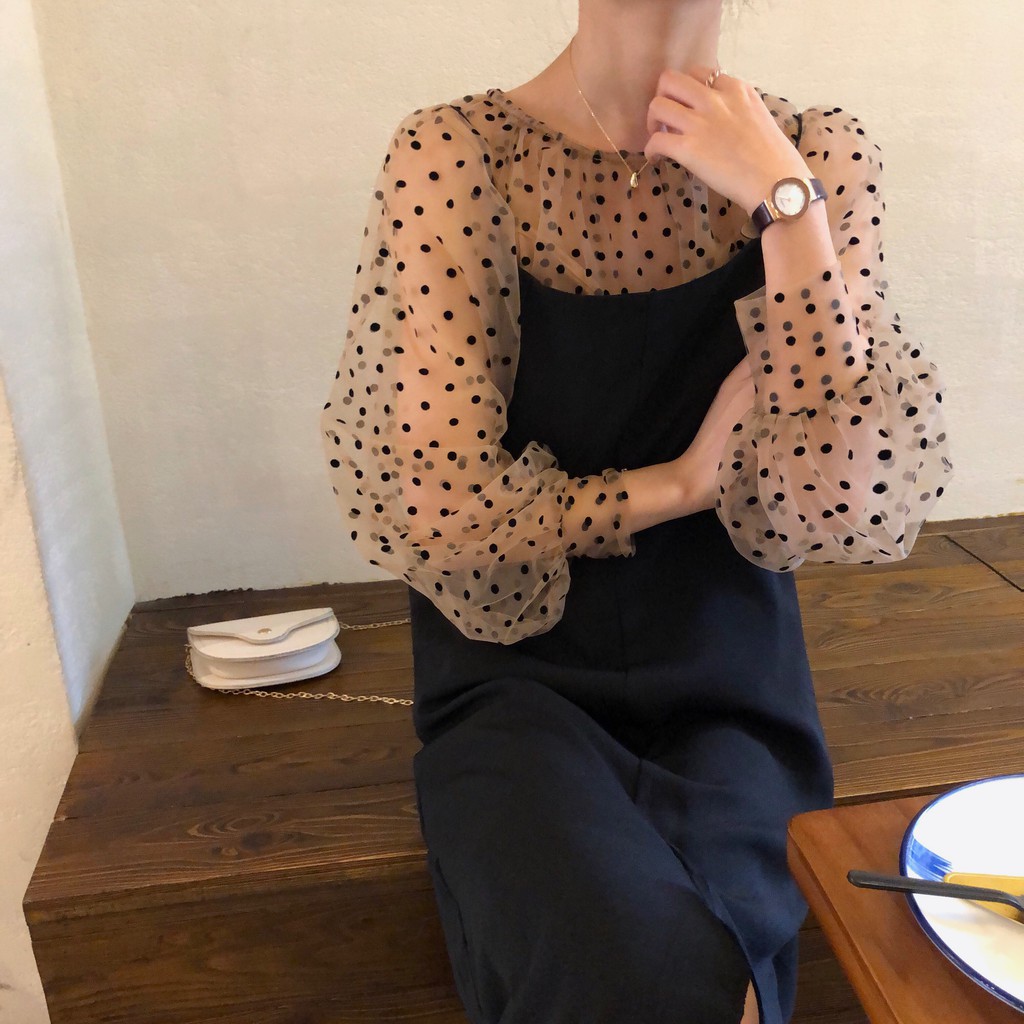 Baju Lengan Panjang Warna Putih Motif Titik Model Wave dan Longgar Bahan Kain Kasa untuk Perempuan | Shopee Indonesia