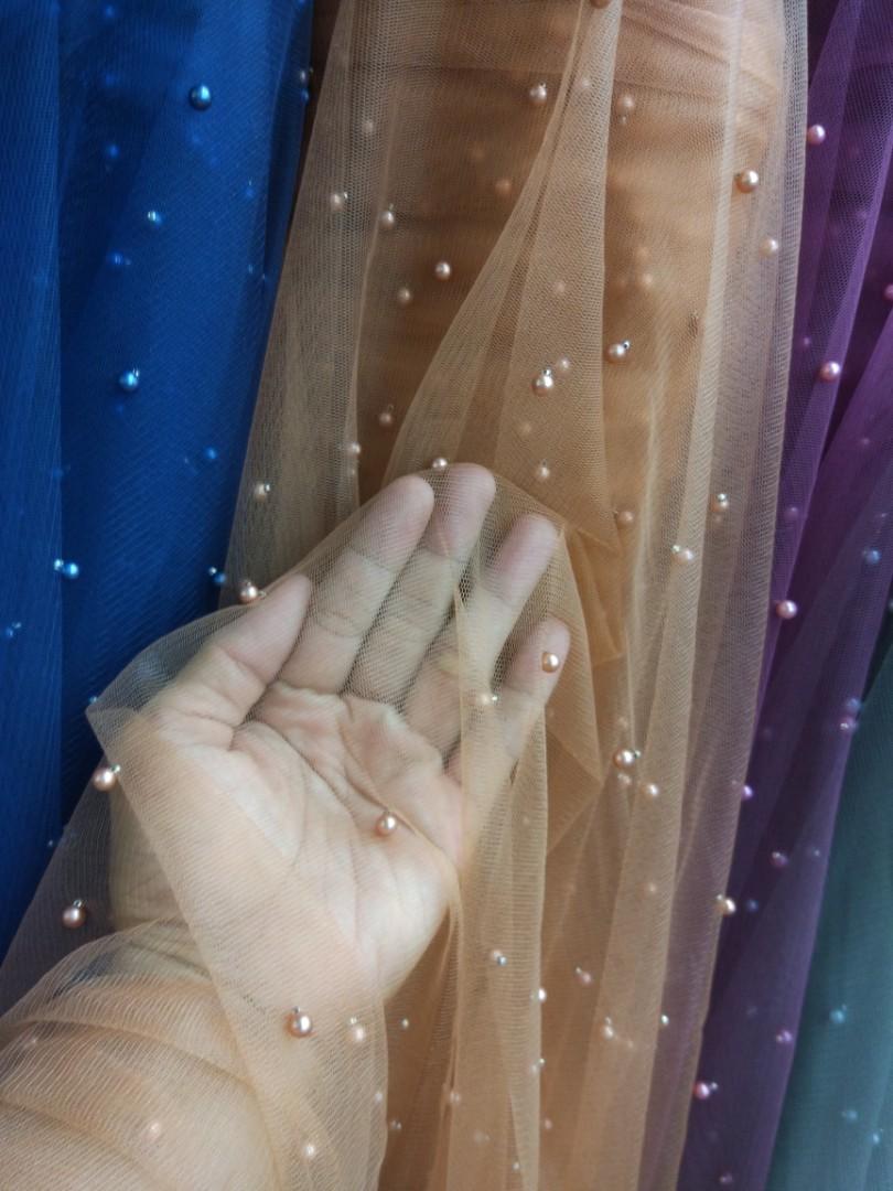 Kain Gaun/kebaya Tulle Payet Mutiara, Fesyen Wanita, Pakaian Wanita, Gaun & Rok di Carousell