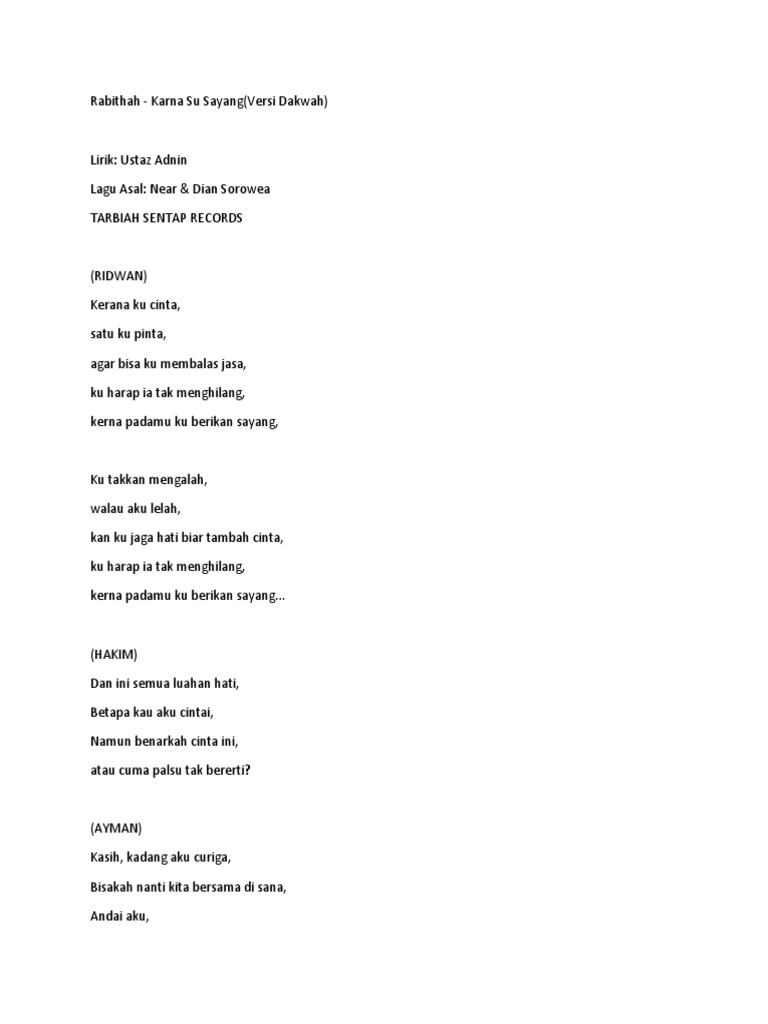 LIRIK LAGU - Karna Su Sayang - Near - Wattpad