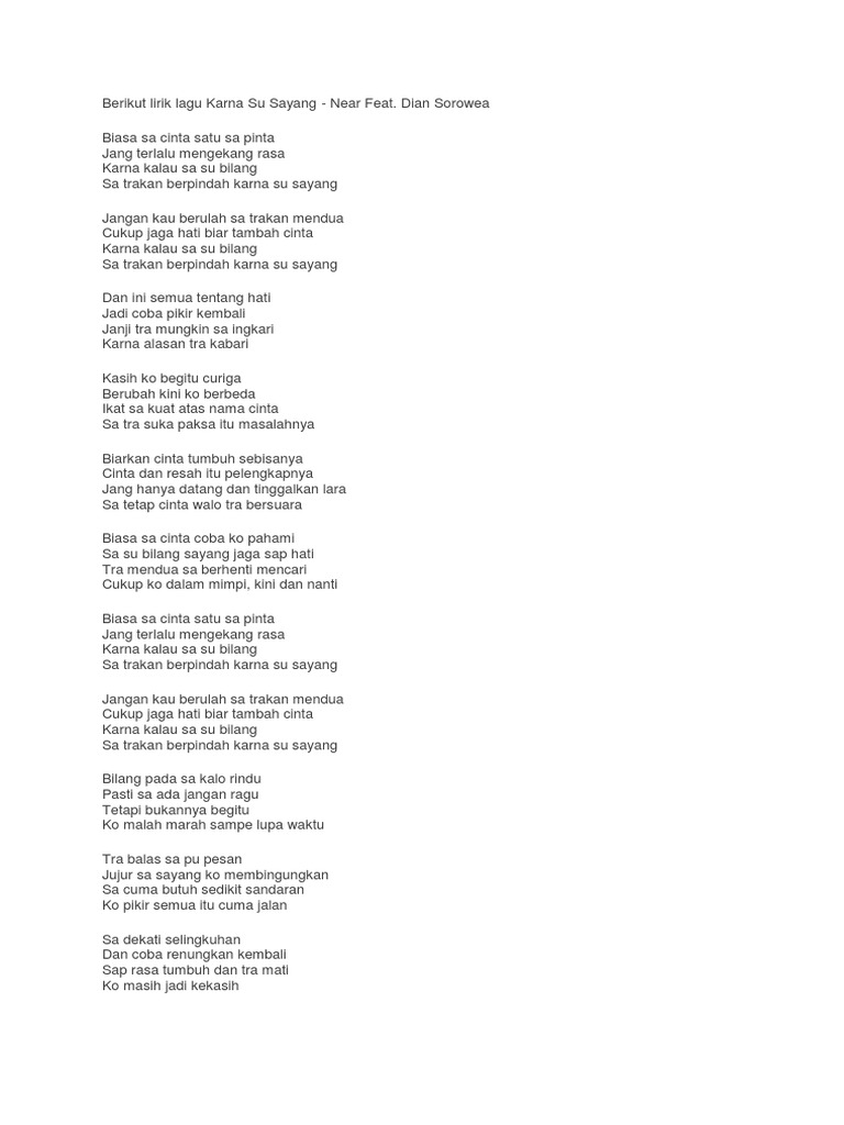lirik lagu near - karna su sayang ft dian sorowea | Lirik lagu …