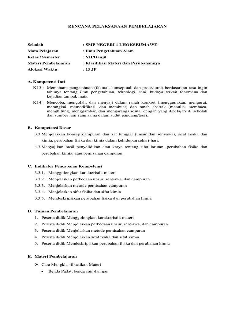 RPP Perubahan Materi Secara Fisika Dan Kimia