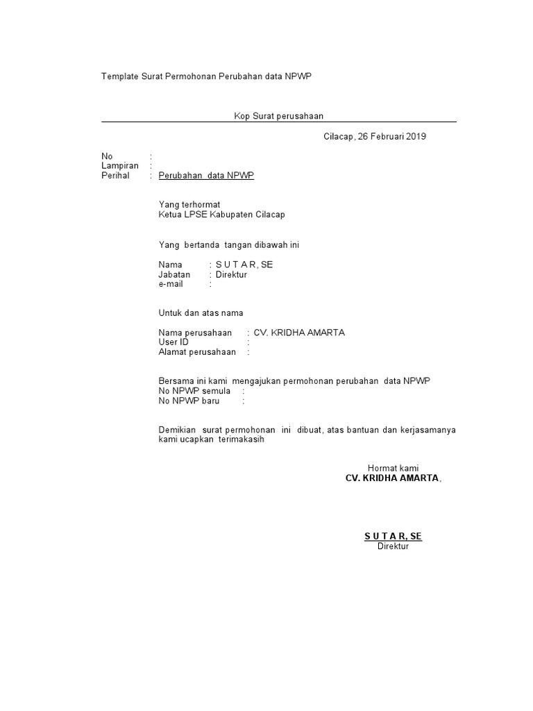 DOC) Contoh Surat Permohonan Perubahan NPWP KOP SURAT PENYEDIA | arminbuton butonarmin - Academia.edu