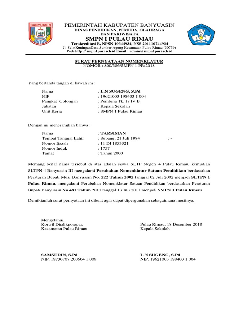 Surat Keterangan Perubahan Nomenklatur Sekolah