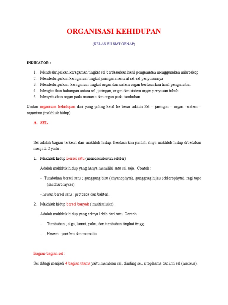 Rangkuman Materi Sistem Organisasi Kehidupan Kelas 7 Kurikulum …