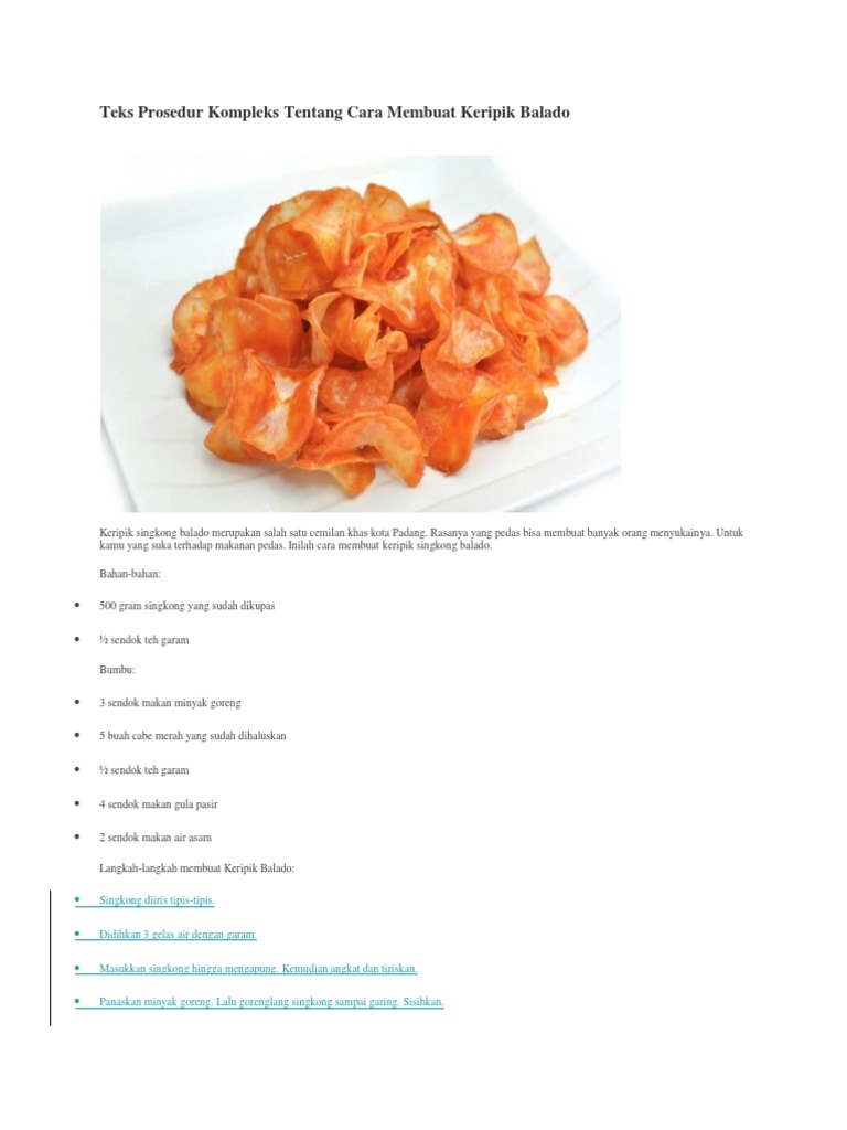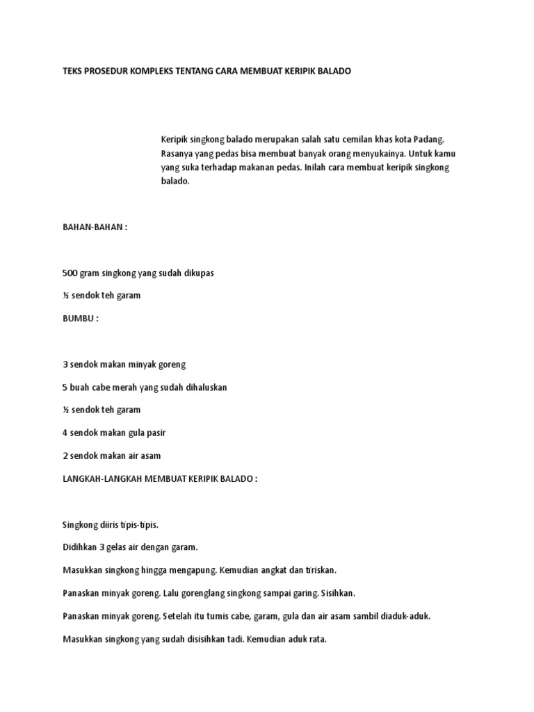 TEXT PROSEDURE.docx - Contoh Teks Prosedur Kompleks Tentang Cara Membuat Keripik Balado Keripik singkong balado merupakan salah satu cemilan khas kota | Course Hero