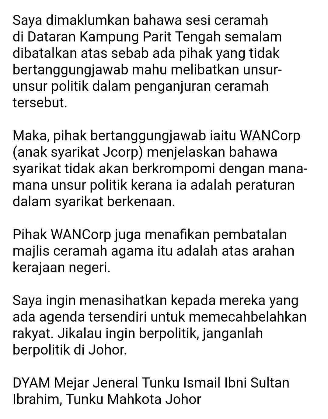 HRH Crown Prince of Johor på Twitter: “Saya dimaklumkan bahawa sesi ceramah di Dataran Kampung Parit Tengah semalam dibatalkan atas sebab ada pihak yang tidak bertanggungjawab mahu melibatkan unsur-unsur politik dalam penganjuran
