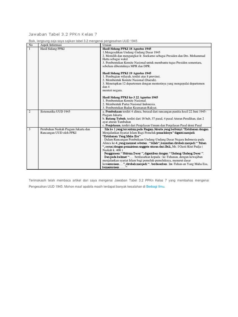 Jawaban Tabel 3.2 Ppkn Kelas 7: Hasil Sidang Ppki 18 Agustus 1945