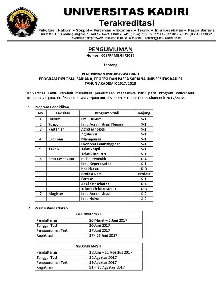Dibuka Penerimaan Mahasiswa Baru Tahun Akademik 2017/2018 – FAKULTAS HUKUM – UNIVERSITAS KADIRI