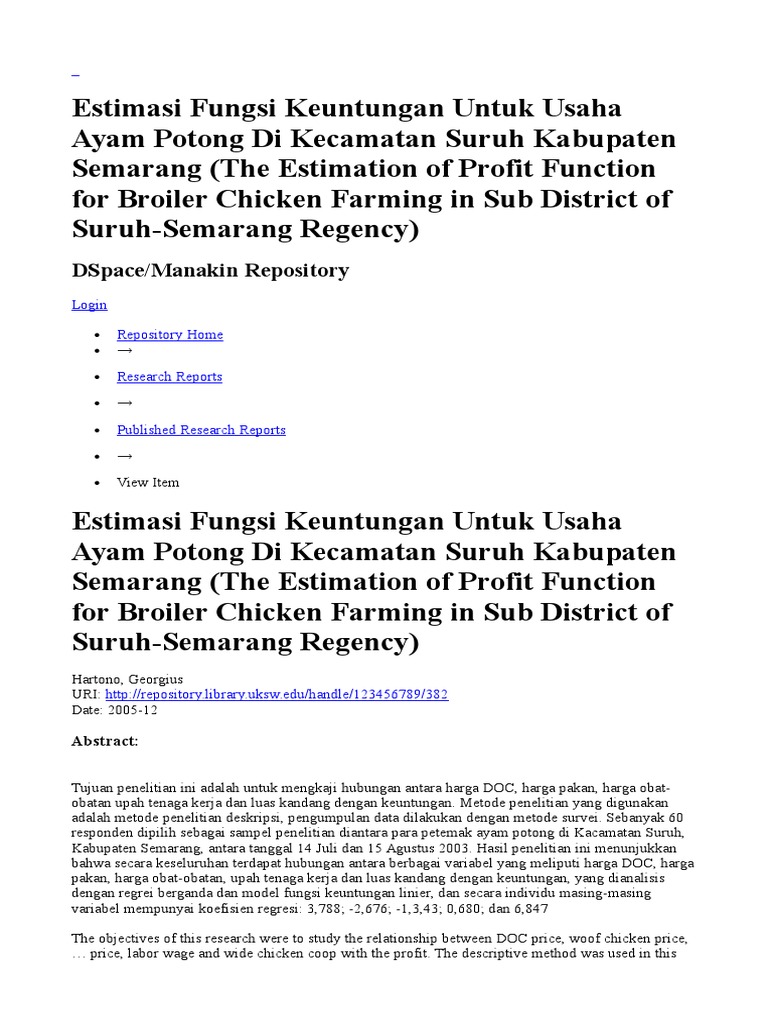 Estimasi Fungsi Keuntungan Untuk Usaha Ayam Potong Di Kecamatan Suruh Kabupaten Semarang