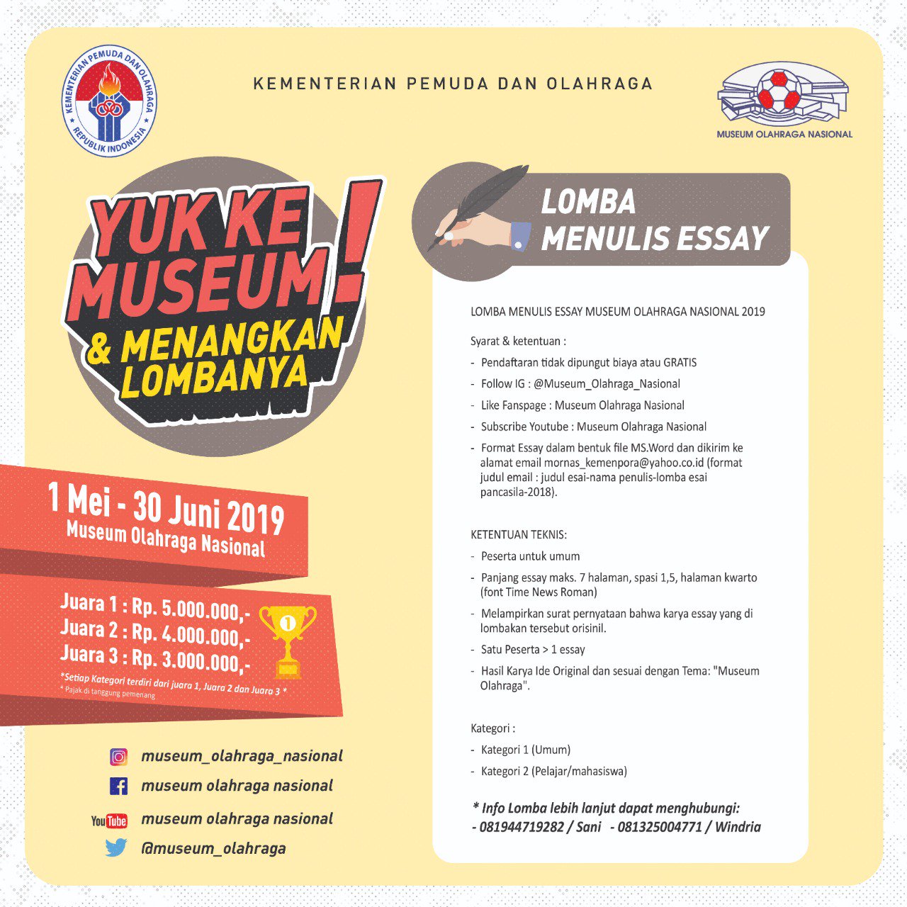 Museum Olahraga Nasional on Twitter: “Sobat Mora ayo ikut lomba, untuk mengasah pengetahuan ttng @museum_olahraga dan sejarah olahraga indonesia ..siapa tau bs dpt hadiahnya..lombanya adalah lomba vlog, lomba essay dan lomba fotografi.. #
