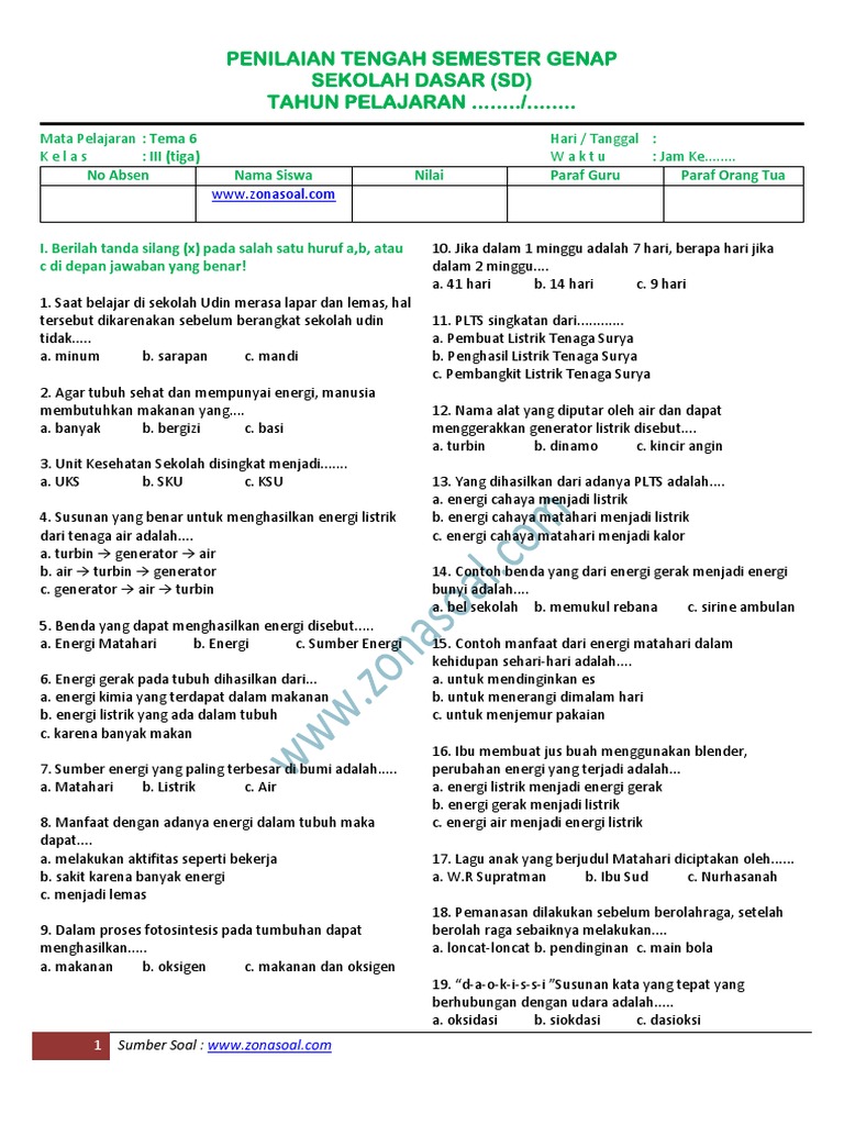 Soal Ulangan Harian Tema 6 Kelas 3 semester 2 Kur13 | TutorialPelajaran.com