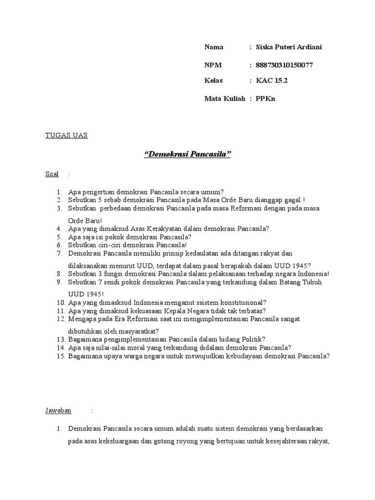 Soal dan jawaban UTS MK Pancasila Prodi Adm Negara Semester Ganjil
